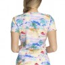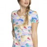 Mūsdienīga blūze ar raibo printu, V-veida kakla izgriezumu, uzšūtām kabatām un sānu šķēlumiem ērtākām kustībām.