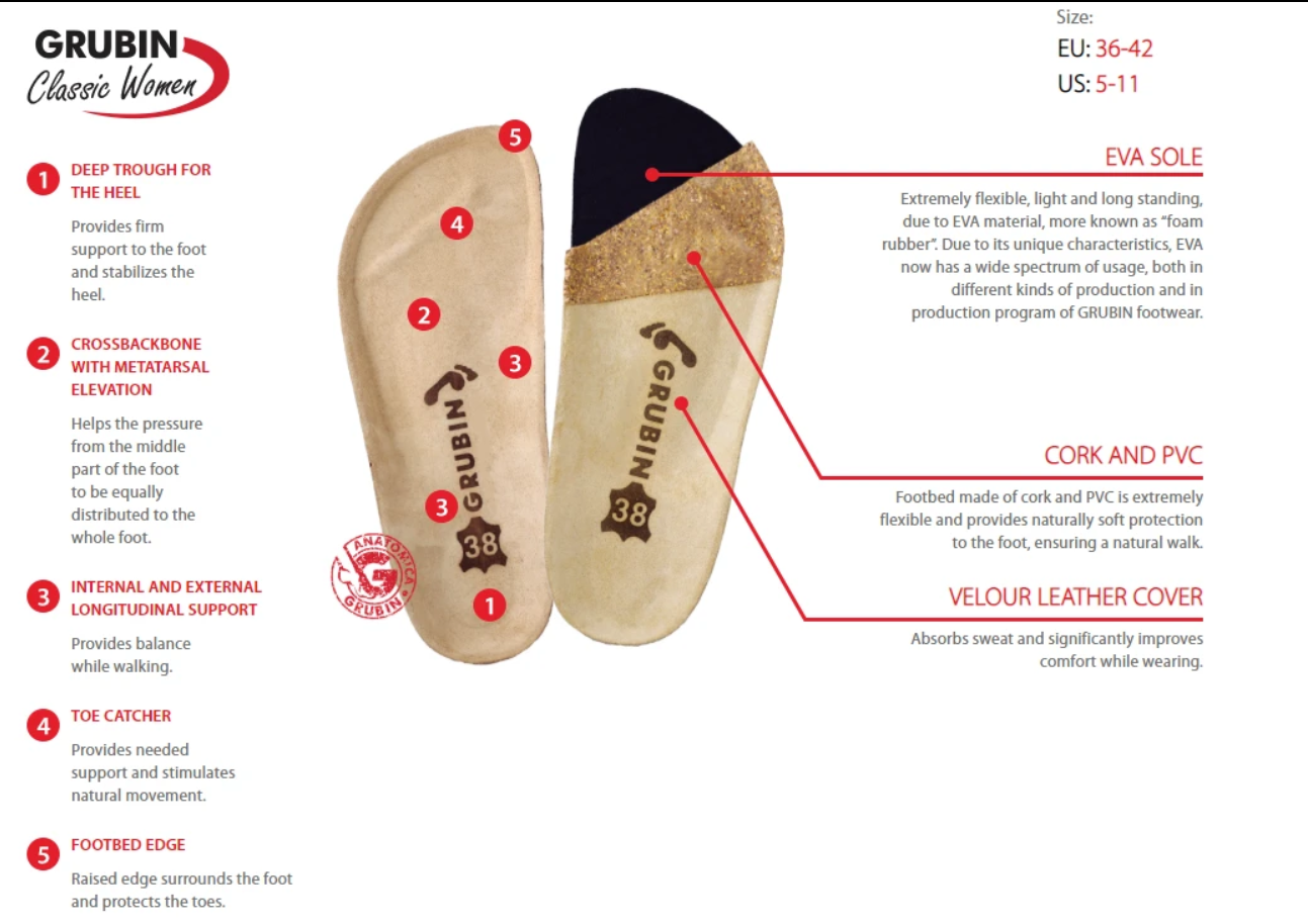 Обувь Grubin производится только из экологически чистых материалов, безопасных для здоровья человека и окружающей среды в тесном сотрудничестве с врачами-ортопедами.